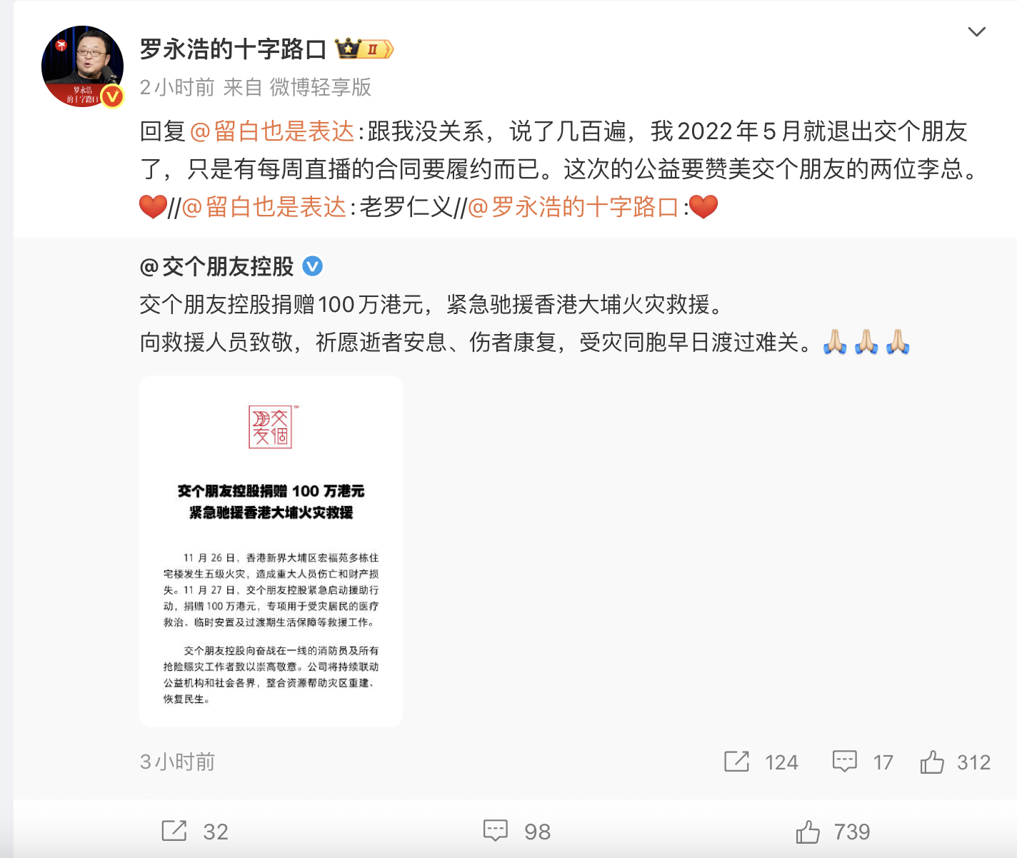 评论区有网友表示:“老罗仁义”。对此罗永浩回复:跟我没关系,说了几百遍,我2022年5月就退出交个朋友了,只是有每周直播的合同要履约而已,这次的公益要赞美交个朋友的两位李总。
