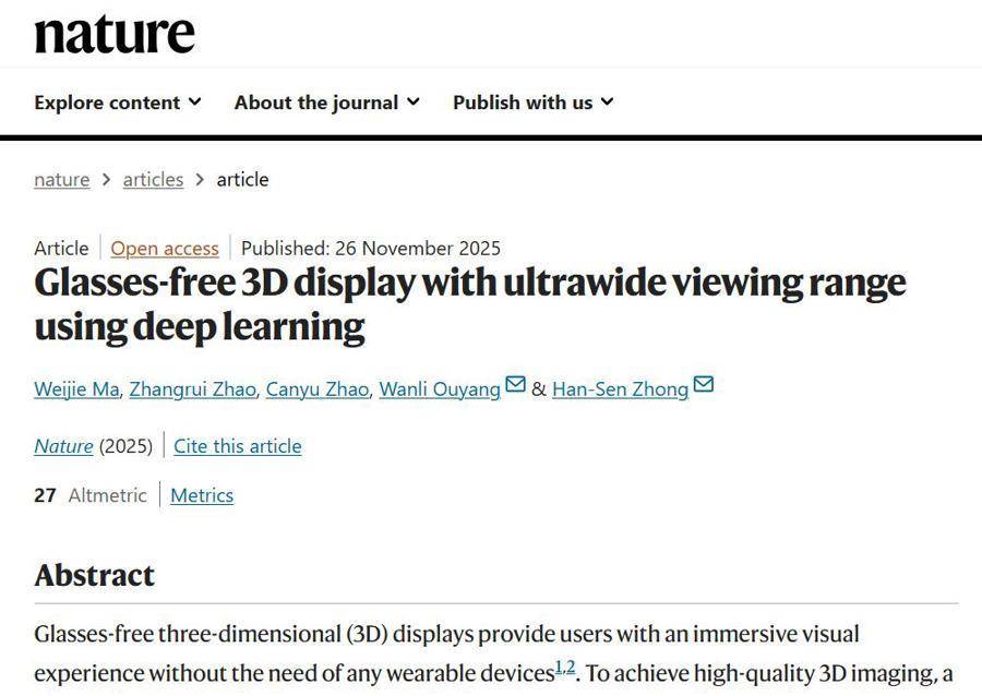 技术圈梦寐以求的完美3D显示效果,因为上海科研人员的突破性创新,忽然间似乎不再遥远。昨天凌晨,国际顶尖学术期刊《Nature(自然)》发表了上海人工智能(AI)实验室联合复旦大学等共同完成的论文,介绍了一种全新裸眼3D显示系统,解决了困扰业界几十年的难题:大屏幕与宽视角不可兼得。