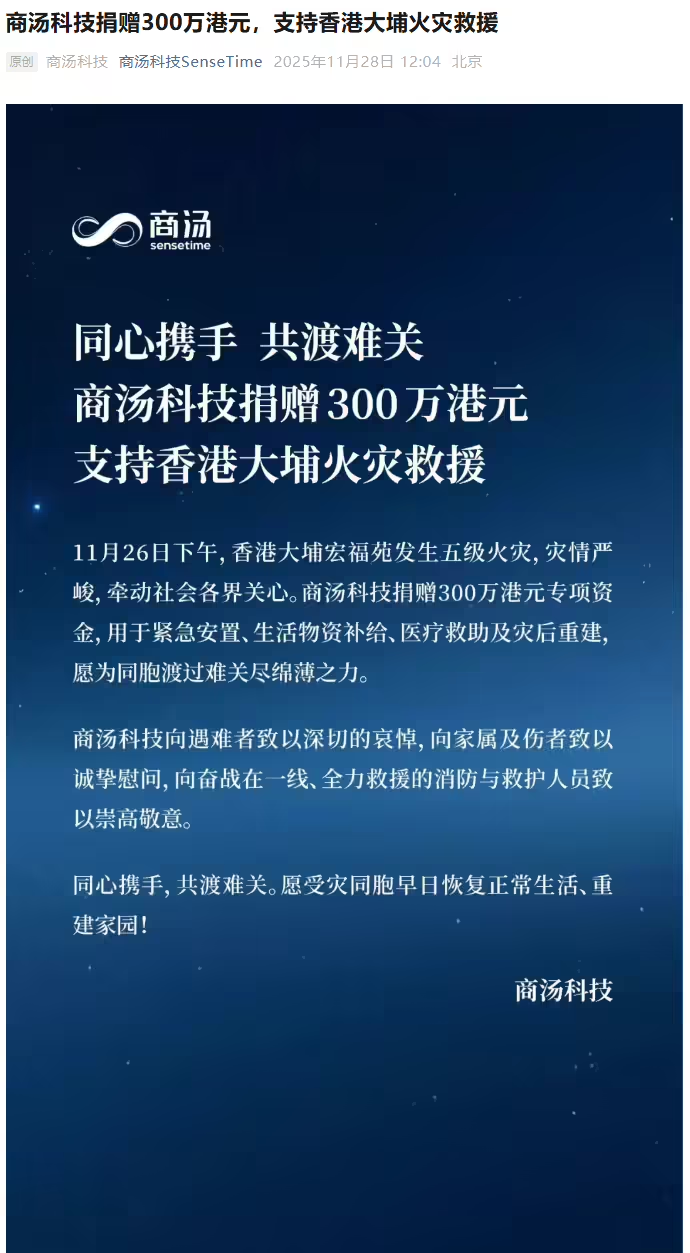 11月28日,商汤科技宣布捐赠300万港元,支持香港大埔火灾救援。