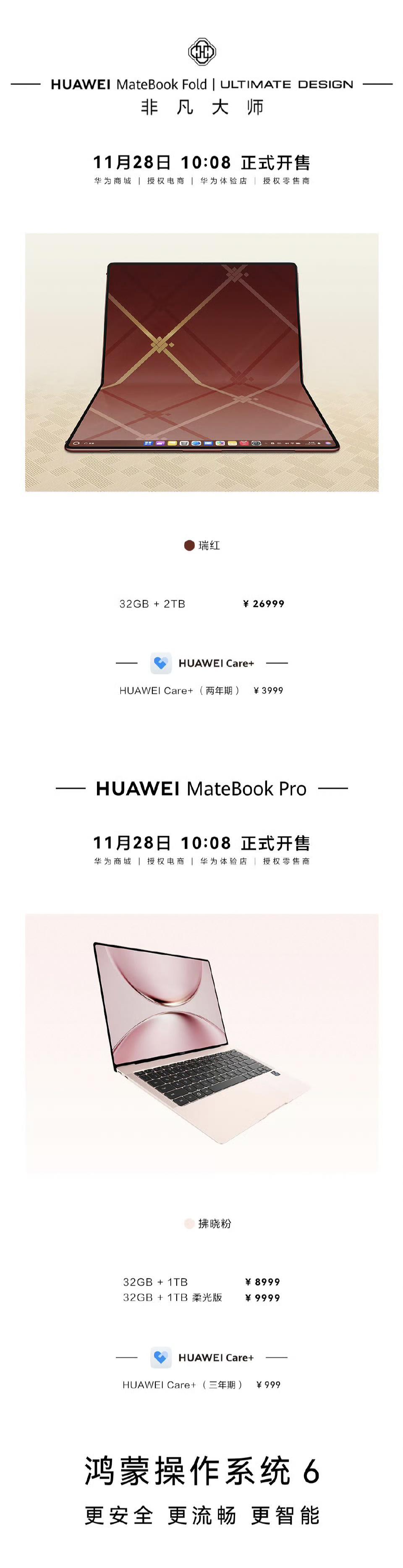 售价方面,全新配色华为 MateBook Fold 非凡大师瑞红 32GB / 2TB 版售价 26999 元;华为 MateBook Pro 拂晓粉 32GB/1TB 版本售价为 8999 元,32GB/1TB 柔光版售价 9999。