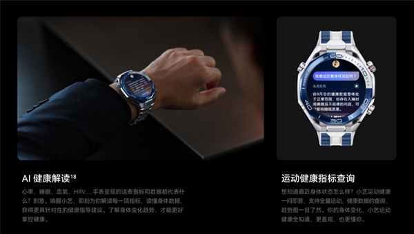 在健康管理方面,手表首发腕上鸿蒙智能体,支持AI运动解读、AI健康问答,X-TAP智感窗集成ECG、PPG、压感等传感器,健康监测更精准。