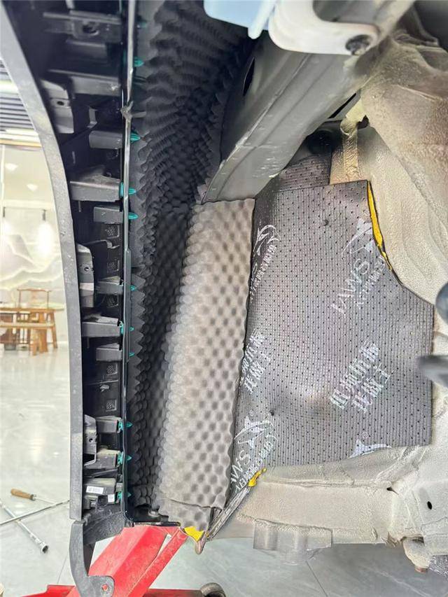底盘和后备箱是低频共振的主要产生部位,技师先使用金鲨JS300对底盘和后备箱做止振处理,减少低频共振的产生;再使用隔音垫对底盘和后备箱做隔音处理,减少噪声的传播;最后使用银鲨棉对底盘和后备箱做吸音处理,将噪声进一步吸收,以保证隔音的效果。
