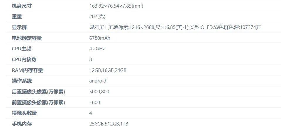 其他方面,该机将搭载高通骁龙 8 至尊版处理器,采用了一块 7000mAh 电池(额定容量 6780mAh),提供了 12/16/24GB 内存、256/512/1TB 机身存储;前置 16MP 自拍摄像头,后置 50MP 主摄 + 8MP 超广角镜头。