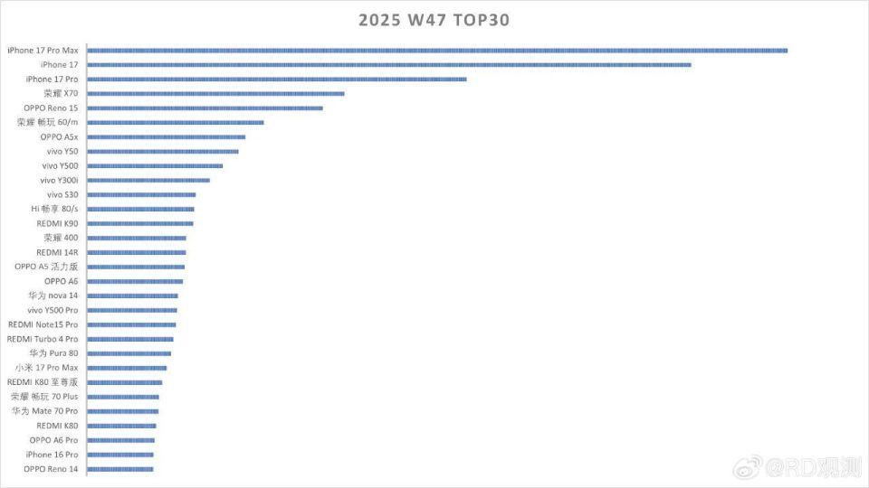 就像这一波旗舰大战一样,当进入平销期之后。iPhone 17系列依然热卖,而安卓阵营甚至单品销量榜都上不去。不信大家看行业人士“RD观测”今天提供的W47周单品销量Top30榜,榜单显示单品销量前三牢牢被iPhone 17系列霸占,且是自iPhone 17系列正式商用以来,安卓旗舰就没有进过前三,不同的是iPhone 17与iPhone 17 Pro有时候会互换一个位置,但iPhone 17 Pro Max第一的位置根本没人能够撼动。所以我们抛开iPhone 17系列不讲,谈谈这产这一波旗舰看看都有谁出现在榜单上。