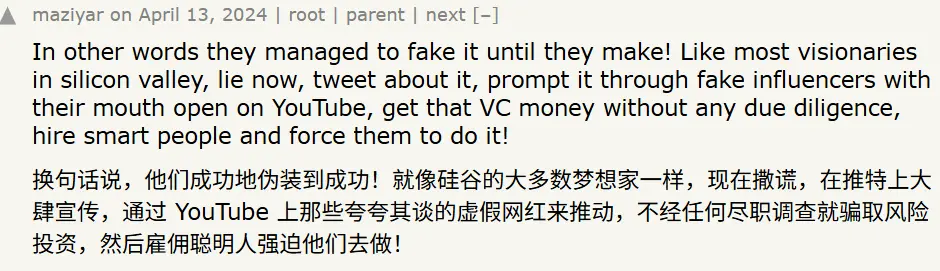 Hacker News 上的一位开发者一针见血地总结了这种「先吹牛,后实现」的危险策略:现在的剧本是:先撒谎…… 发推特吹嘘…… 拿到 VC 的钱…… 然后雇一群聪明人被迫把它做出来!