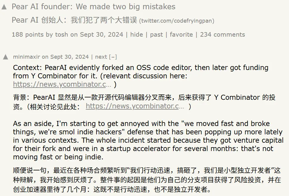 当被社区抓包试图修改开源许可证时,Pear AI 的创始人试图用「我们只是独立黑客(Indie Hackers)」、「想在这个领域做点事」来博取同情。但在 30 万美元的年薪放弃宣言和 YC 的光环映衬下,这种辩解被社区斥责为「自恋者的非道歉式道歉」。这不再是技术创新,更像是一场资本加持下的各种「套壳」游戏。