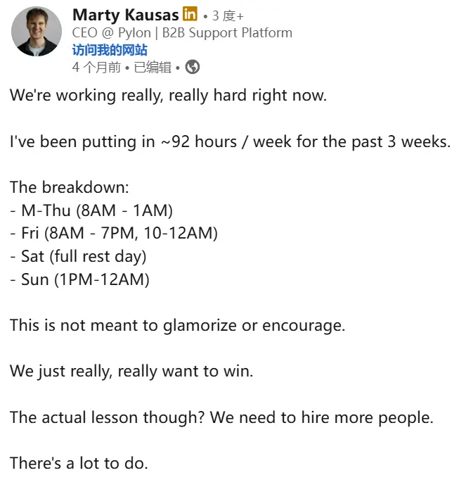 Marty Kausas 甚至在领英上公开炫耀他的工时表:连续三周,每周工作 92 小时。这包括周一到周四从早上 8 点干到凌晨 1 点,周五干 13 个小时,连周日也要「轻松」地干上 11 个小时。