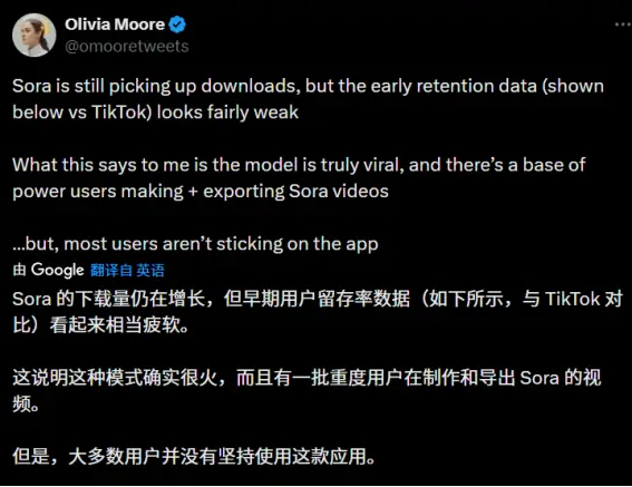 近日,硅谷风投机构a16z合伙人Olivia Moore在社交媒体上爆料称,Sora 的下载量仍在增长,但早期用户留存率数据(如下所示,与 TikTok 对比)看起来相当疲软。