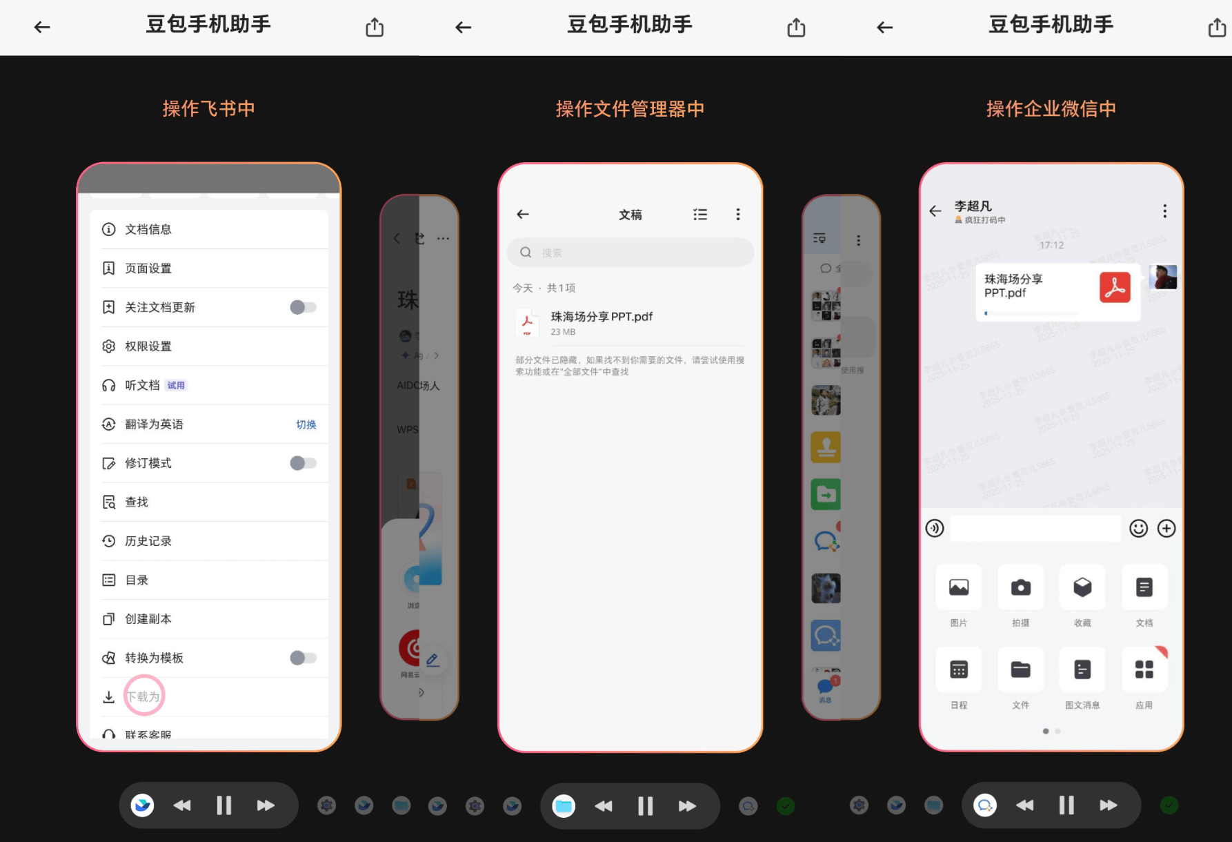 我直接对着豆包手机助手说:「从微信聊天记录里找刚才那个文件发给xx,再把飞书那个季度总结文档转成 PDF 发到企业微信给xx。」
