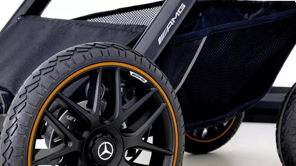 此外还有 Mercedes-AMG GT2 版。尽管名字令人联想到赛道利器,但其并非玩具,而是该系列中最为紧凑的型号,专为轻松收纳进汽车后备厢而设计。该款推车还配备了 AMG 标志性十字辐条轮毂,并点缀以干邑棕色细节,包括装饰缝线以及遮阳篷上刺绣的 AMG 徽标。