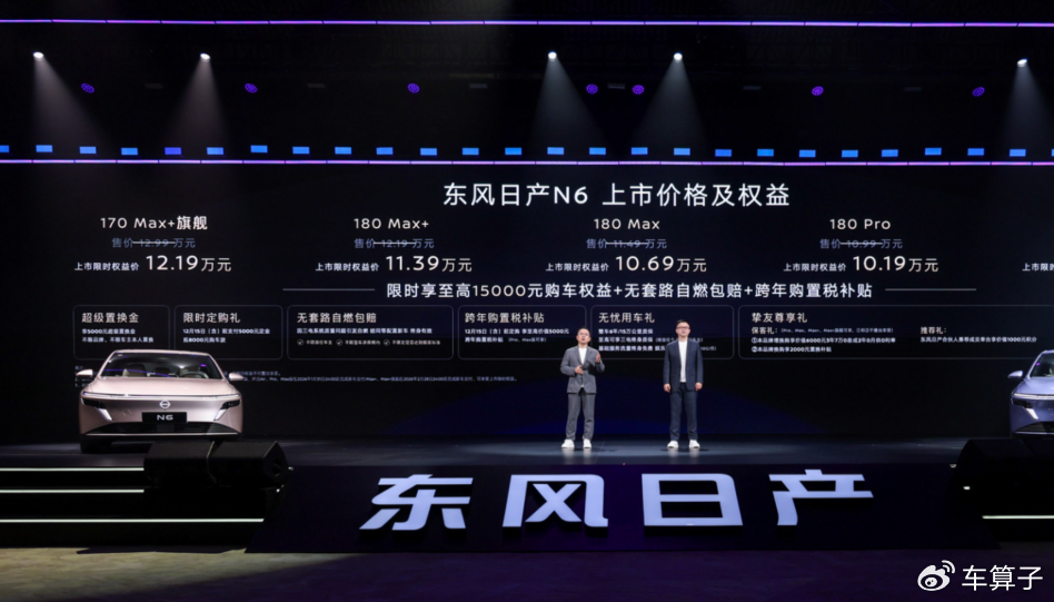 12月1日,东风日产N6(配置|询价)正式上市,新车推5款车型,指导价9.99-12.99万元,限时权益价9.19-12.19万元。作为天演架构首款插混轿车,定位中型车,CLTC纯电续航180km,对标比亚迪秦L(配置|询价)、银河A7等。