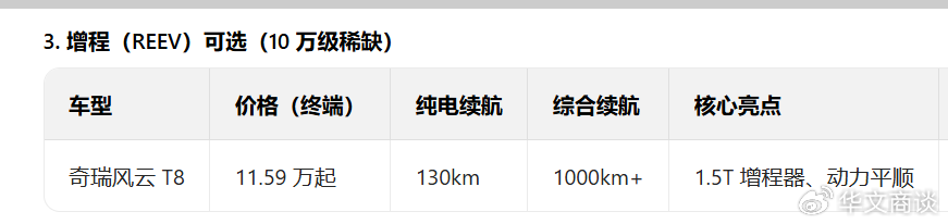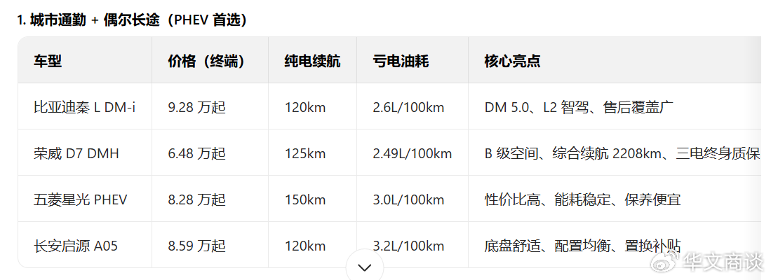 增程式(如理想、深蓝):发动机只发电,全程由电机驱动,驾驶体验像纯电车。但在10万价位,目前几乎没有增程车型可选。