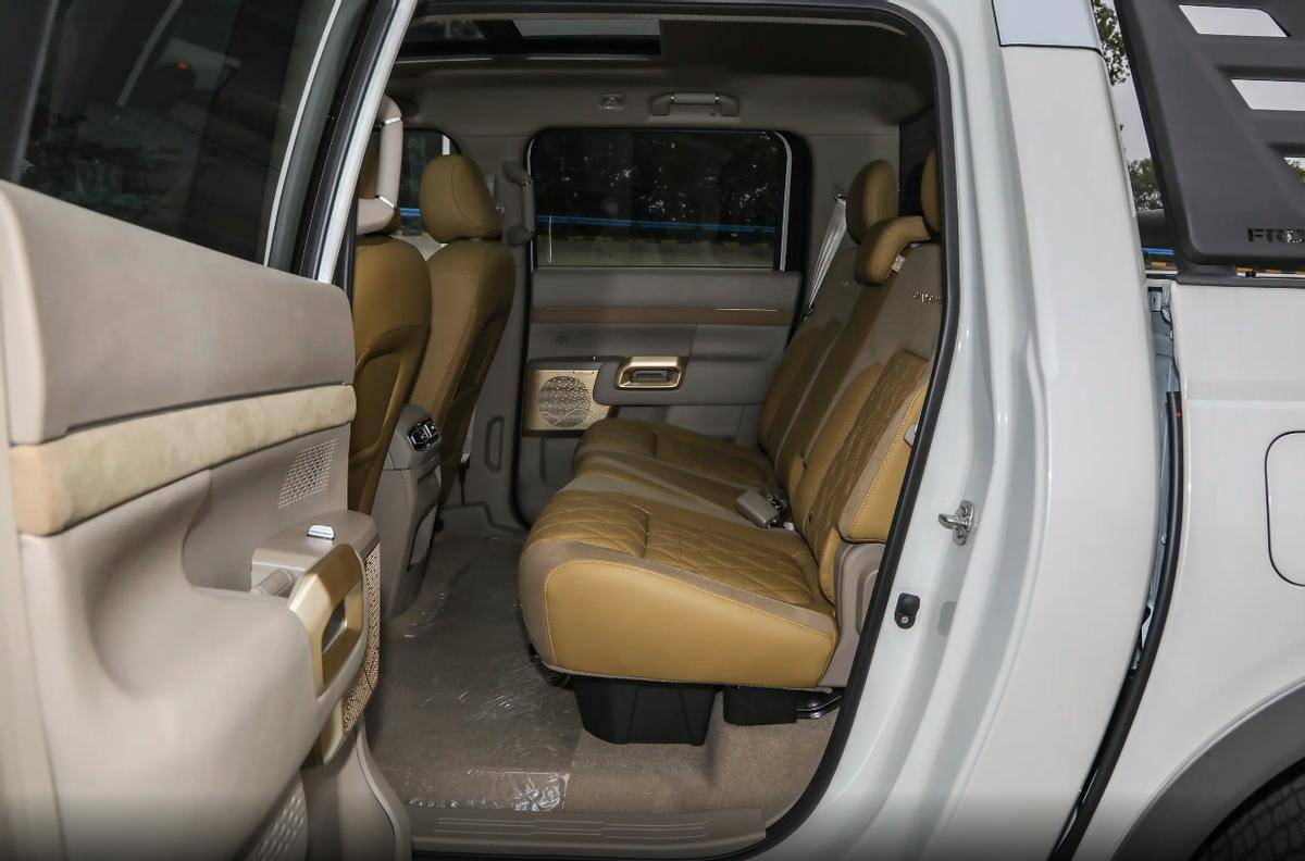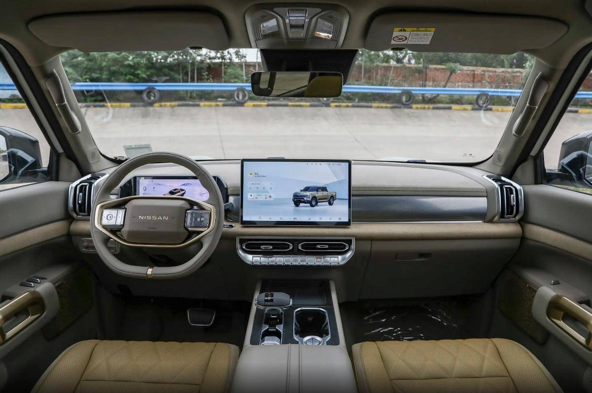 进入车内,锋坦Frontier Pro的内饰氛围一改此前皮卡车型的粗犷风格,台面区域配有阶梯式的立体结构,并且包覆了相对软质的面料包覆,台面中央配有14.6英寸的悬浮中控大屏,与10英寸的液晶仪表共同构成了车内的交互主界面,进一步向新能源时代靠拢。车内座椅根据车型版本提供了仿皮和真皮两种选择,并支持电动调节、通风、加热等功能,达到了乘用SUV的水准,这些配置无一不在强调这款皮卡向舒适性与品质感的转变。