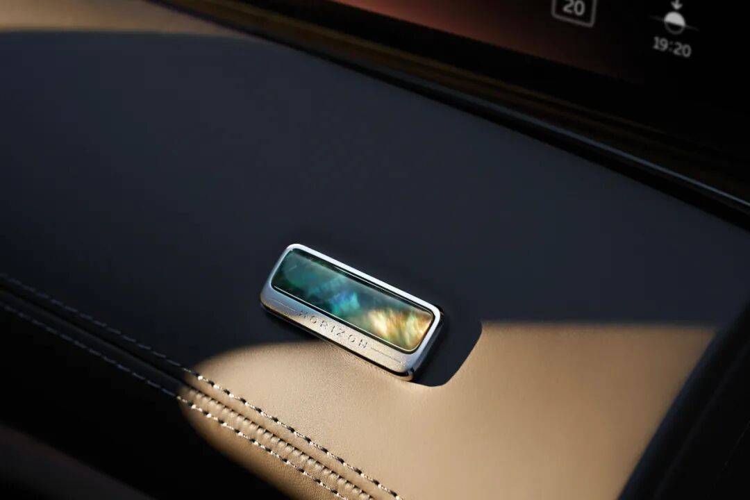 而除了设计本身之外,蔚来对于用料的选择也精准把握了全球豪华车的“共性”,如同劳斯莱斯的“画廊”艺术仪表台爱用珍贵材料进行装饰一样,ET9地平线特别版也在车内仪表台右侧镶嵌了一枚专属铑金臻藏徽章,选用了来自大溪地海域的顶级黑蝶贝母。而包裹它的金属是比黄金更稀有、更具工业价值的铑金。