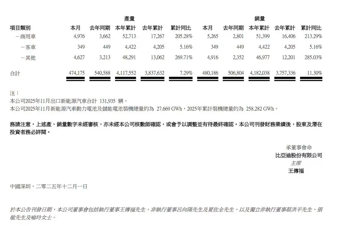 比亚迪集团品牌及公关处总经理李云飞表示,11月销量再度创下年内新高;海外销售突破13万辆,同样创下历史新高。