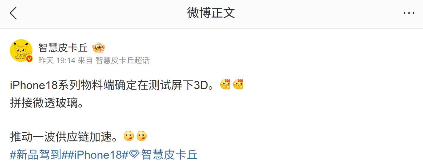 12 月 7 日消息,博主 @智慧皮卡丘 昨天在微博透露,iPhone 18 系列物料端正在测试屏下 3D 人脸解锁功能。