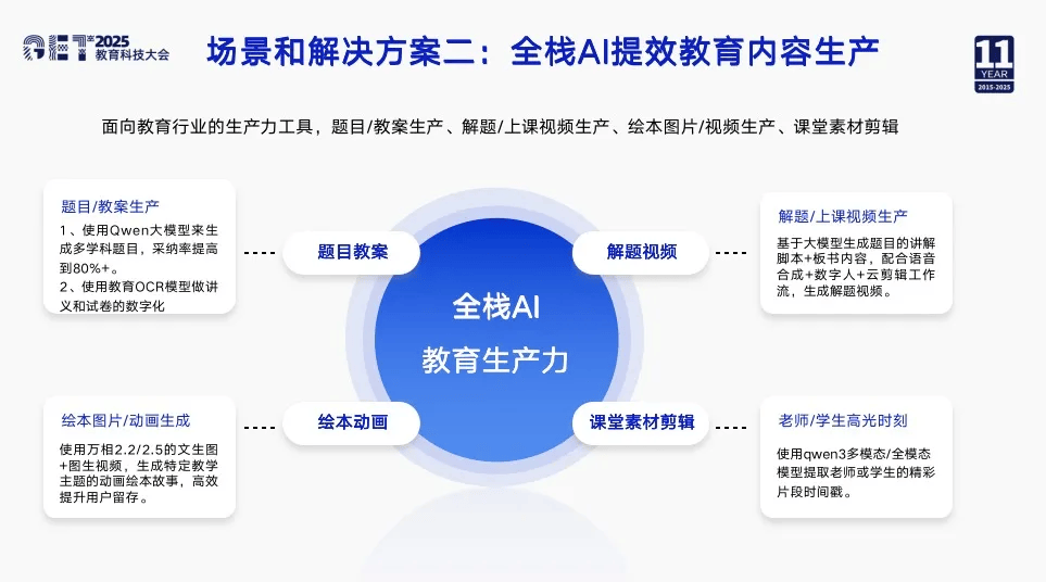 接下来,我会介绍阿里云针对教育行业的全栈AI解决方案。包括这四个方面:教育增长运营、教学内容生产、教学互动和评估,以及课后的知识巩固。