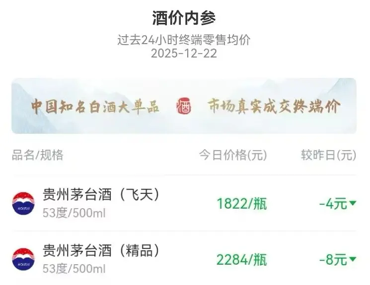 从第三方数据来看,飞天茅台的终端成交表现更趋有序。12月22日,新浪财经“酒价内参”整合全国约200家直营经销商、社会经销商、批发市场及零售网点的实时成交数据,统计显示飞天茅台终端成交均价为1822元/瓶,市场成交逐步回归真实消费主调,交易节奏更加顺畅。