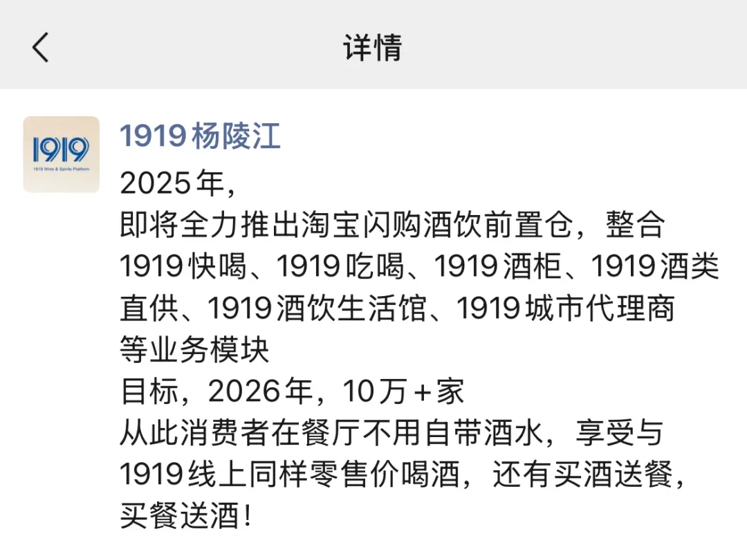 杨陵江近期在朋友圈透露,2025年将全力推出酒饮前置仓,通过整合1919快喝、1919吃喝、1919酒柜、1919酒类直供、1919酒饮生活馆、1919城市代理商等核心业务模块,实现全场景、全链路的资源协同。
