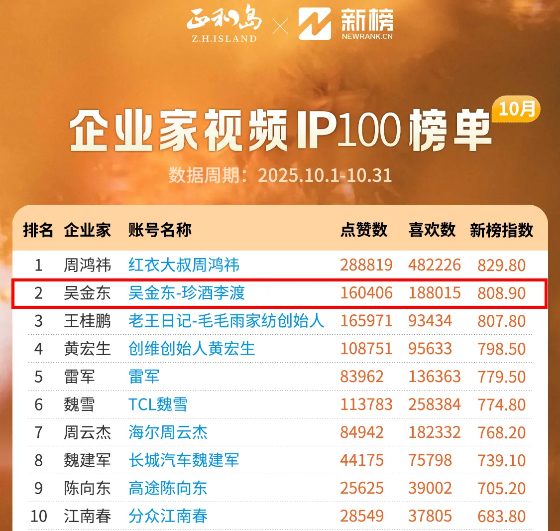 他的视频号也获得了权威认可。近日,正和岛联合新榜发布的《企业家视频IP100榜单(10月)》显示,吴向东视频号“吴金东—珍酒李渡”影响力位列第二。该榜单包括360集团创始人周鸿祎、小米集团创始人兼董事长雷军、海尔集团董事局主席周云杰等知名商业领袖。