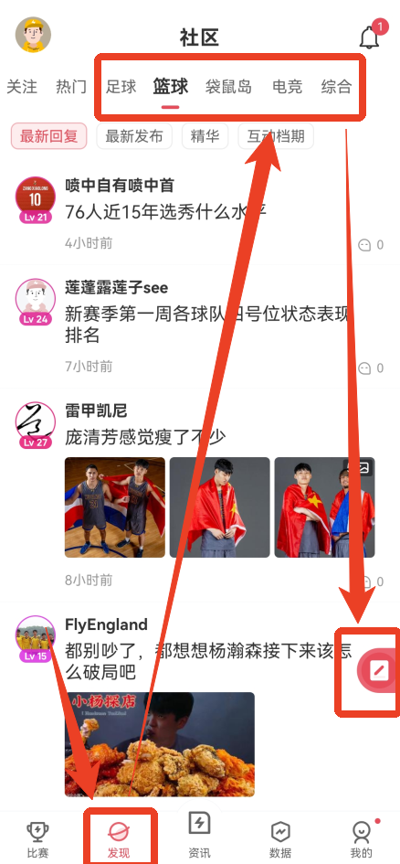 2、点击下方【发现】来到社区,选择一个你喜欢的讨论区,比如足球、篮球、电竞等,然后点击右下方的发帖选项。