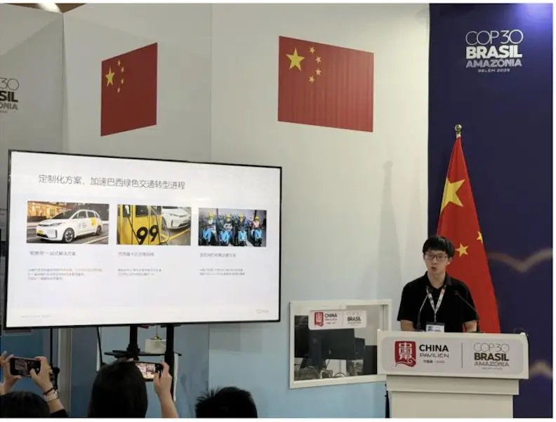 COP30期间,滴滴也参与了由生态环境部应对气候变化司举办的中国角“共建绿色低碳的美丽城市”主题边会,滴滴国际化外卖及西语区出行负责人毛宸宇做了题为 “数字出行助力城市交通减碳”的主题演讲。他表示,“2024年底,中国平台纯电车服务里程占比近七成,仅电动化这一项带来的减碳量达482万吨。在全球绿色发展背景下,我们也积极向海外推广中国绿色出行模式”。