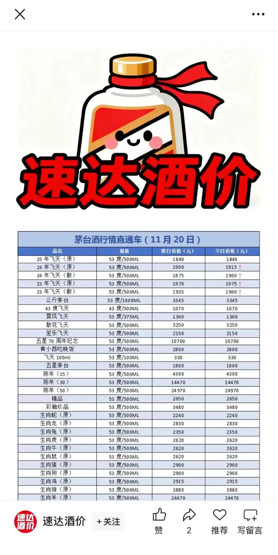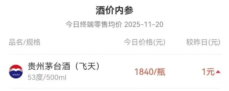 多个来源的酒价数据显示,飞天茅台在全国范围保持良好动销节奏,价盘趋稳。新浪财经“酒价内参”统计全国约200家终端实时数据表明,11月20日飞天茅台成交均价为1840元/瓶,较前一日小幅上升,近半个月都保持平稳。