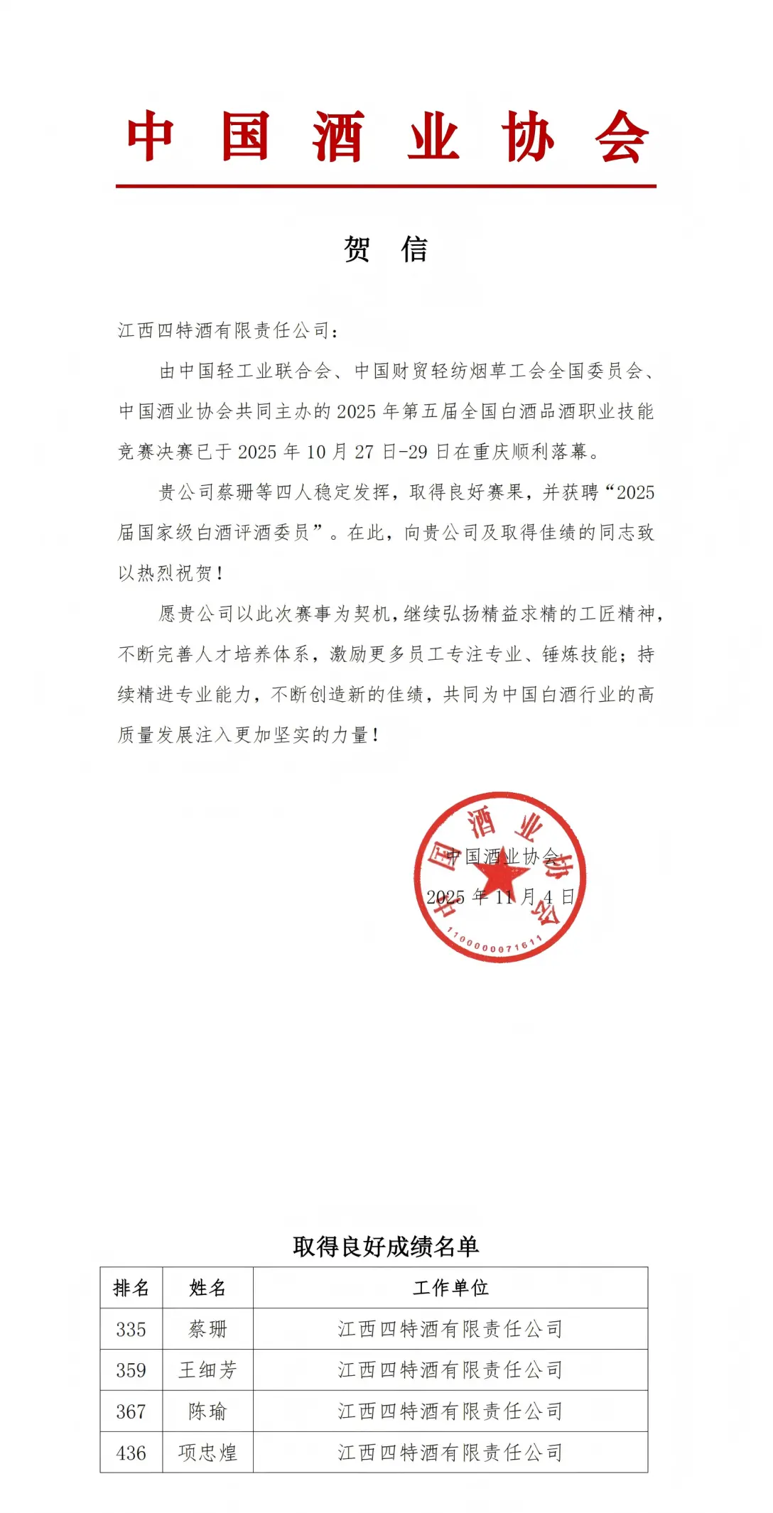11月5日,中国酒业协会公布了2025年第五届全国白酒品酒职业技能竞赛决赛结果,四特酒公司四位技术人才获聘为“国家级白酒评酒委员”,获聘人数位居江西省酒企首位。
