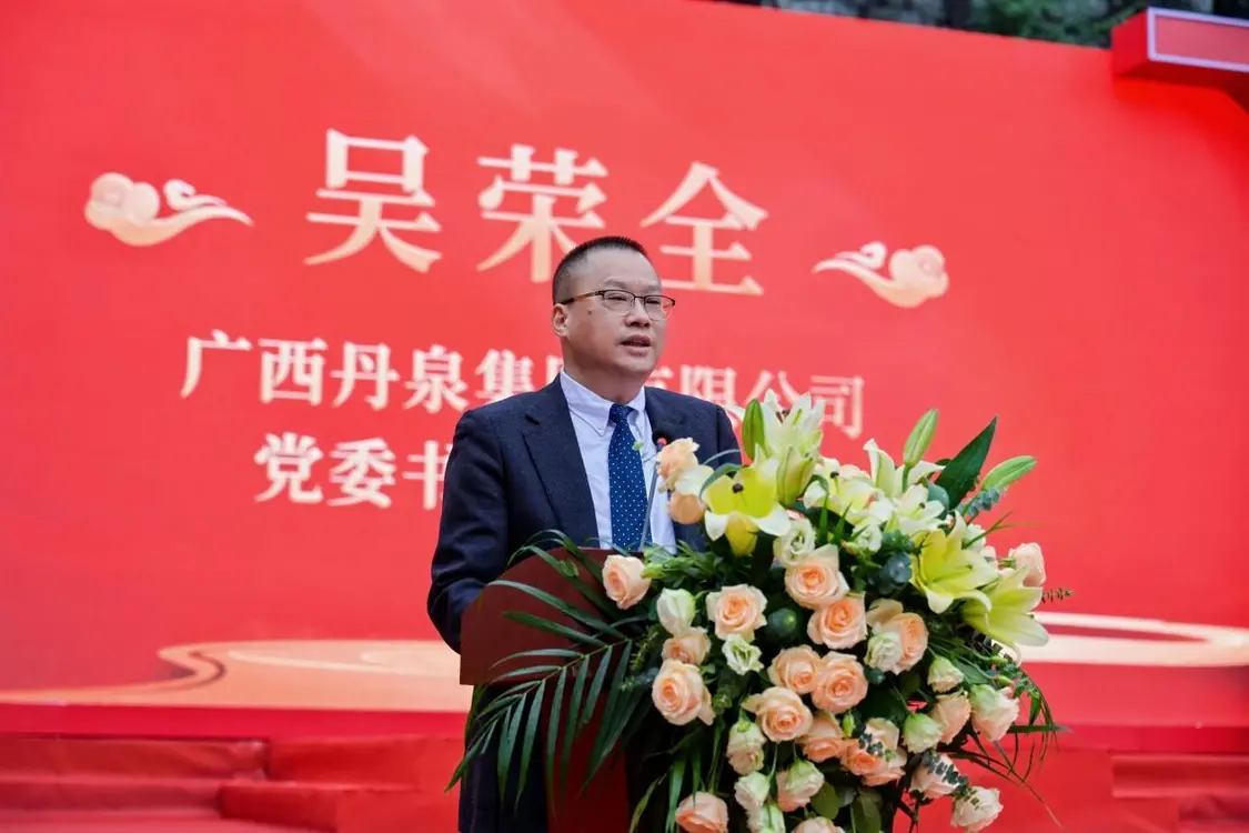 南丹县委书记黄建辉在致辞中充分肯定丹泉作为南丹"金字招牌"的贡献。他指出,丹泉以"12987"坤沙古法为骨,以3.5亿年世界最大天然藏酒洞为窖,创新打造农旅文旅工旅酒旅融合新模式,是南丹产业发展的生动缩影,县委、县政府将全力支持丹泉向"百亿丹泉、百年丹泉"目标迈进。
