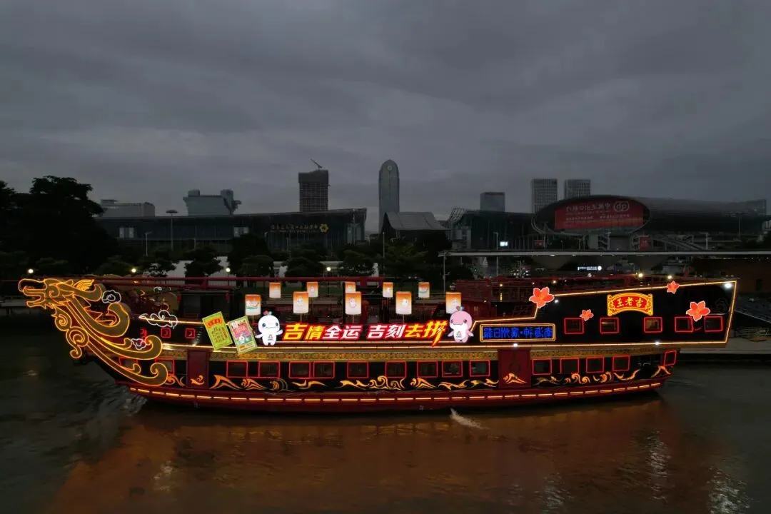 主题船以“吉情全运,吉刻去拼”为设计理念,船体视觉融合了全运会口号、吉祥物“喜洋洋”“乐融融”以及王老吉全运定制产品形象,兼具岭南文化特色与体育竞技元素,构成珠江上一道流动的风景线。