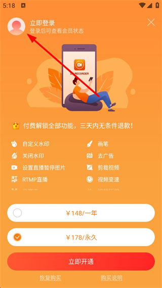 1、打开应用后会看到立即登录提示,登录后可查看会员状态,还有付费解锁全部功能的选项,可选一年或永久套餐,完成登录才能继续后续操作。