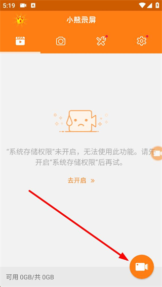 2、进入主界面若提示系统存储权限未开启,无法使用功能,需点击去开启按钮,开启权限后才能正常使用录屏相关的各项操作。