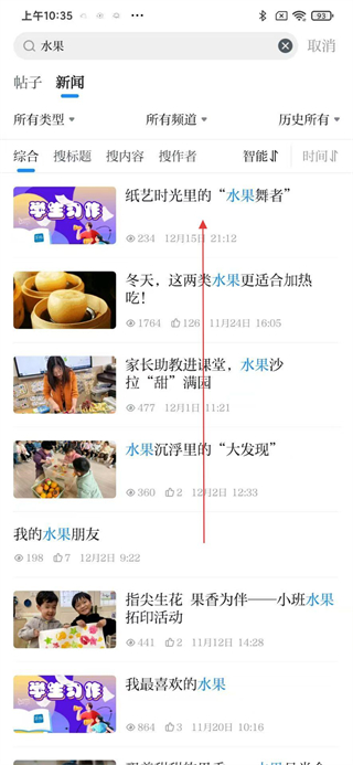 2、登录后在搜索框输入水果关键词,切换到新闻分类,进入相关新闻列表页面浏览内容。