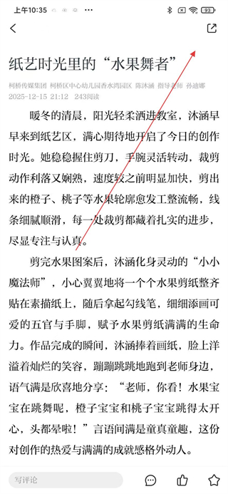 3、在新闻列表页选择目标新闻如纸艺时光里的水果舞者,点击进入该新闻的详情页面查看内容,点击上方的分享按钮。