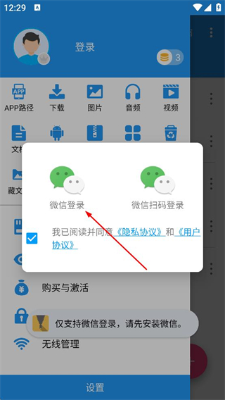 1、打开解压缩全能王软件,进入登录界面选择微信登录,勾选相关协议后完成账号登录。
