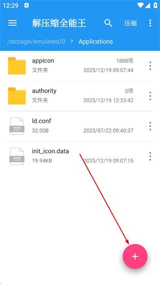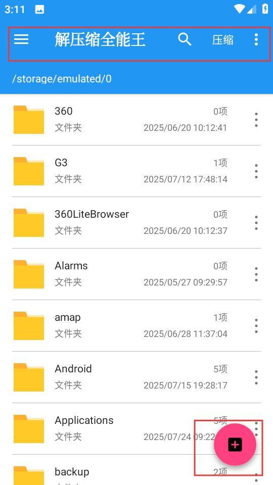 1、主界面顶部显示软件名称,设有搜索和压缩功能按钮,界面展示手机存储中的文件夹列表,点击右下角加号按钮可弹出功能菜单,方便进行新建文件夹、压缩等操作。