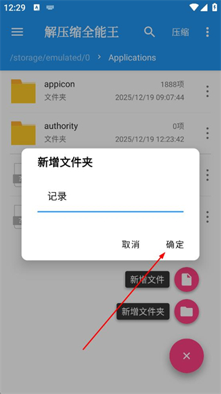 4、在命名输入框中输入记录,确认名称无误后点击确定按钮,完成新文件夹的创建。