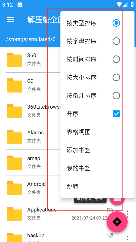 3、在功能菜单中点击排序相关选项,会弹出排序设置窗口,这里提供按类型、字母、时间、大小、备注等多种排序方式,还有升序选项和表格视图切换功能。