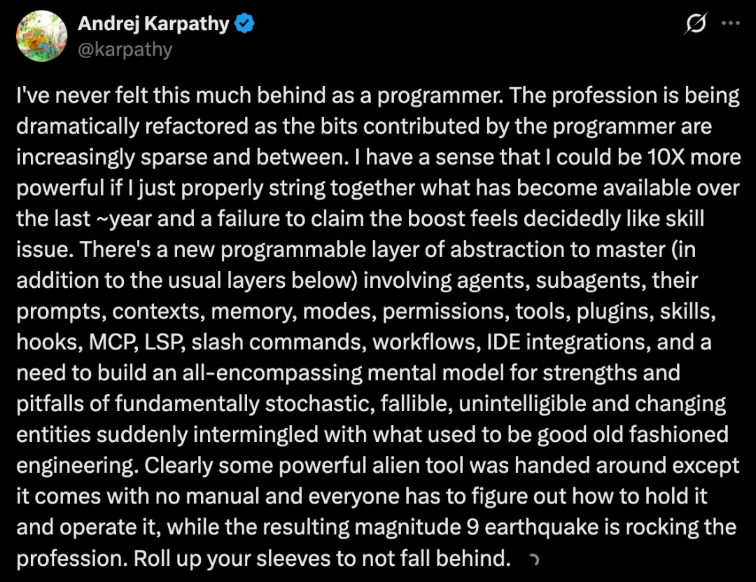 就在刚刚,这位前OpenAI联合创始人、前特斯拉AI总监发出感叹:作为一名程序员,我从未像现在这样感到如此落后