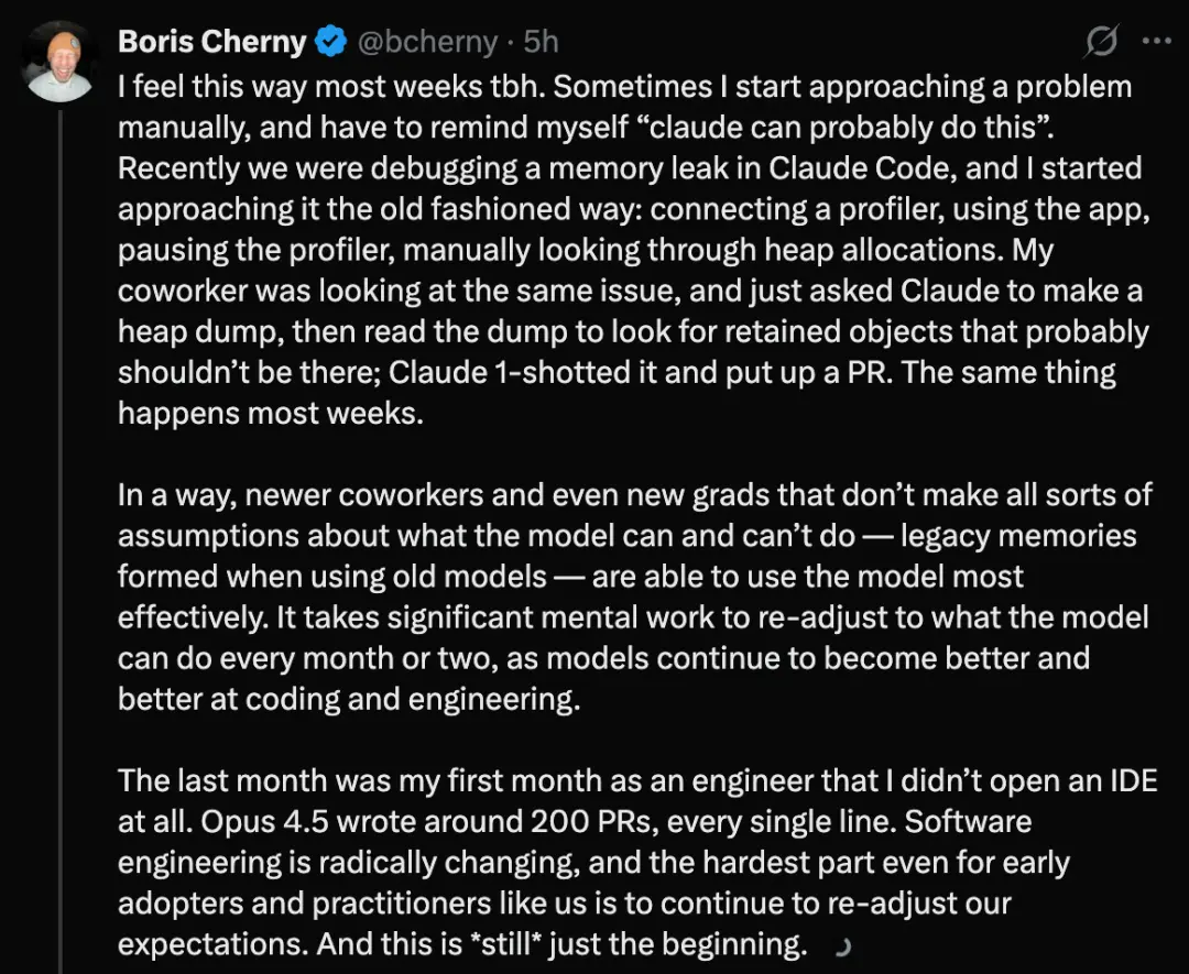 Boris坦言,这需要极大的脑力去适应。有时候他开始手动解决问题,必须强迫自己停下来提醒一句:Claude大概能做这个