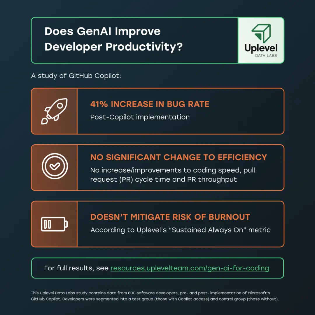 结果发现,使用Copilot的开发者并没有更高效或更少出现倦怠,他们的代码出现错误的频率反而高出41%。