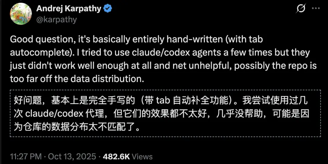 甚至Karpathy在X上的帖子中也表示,他的最新项目「基本上完全是手动编写的」。他说:
