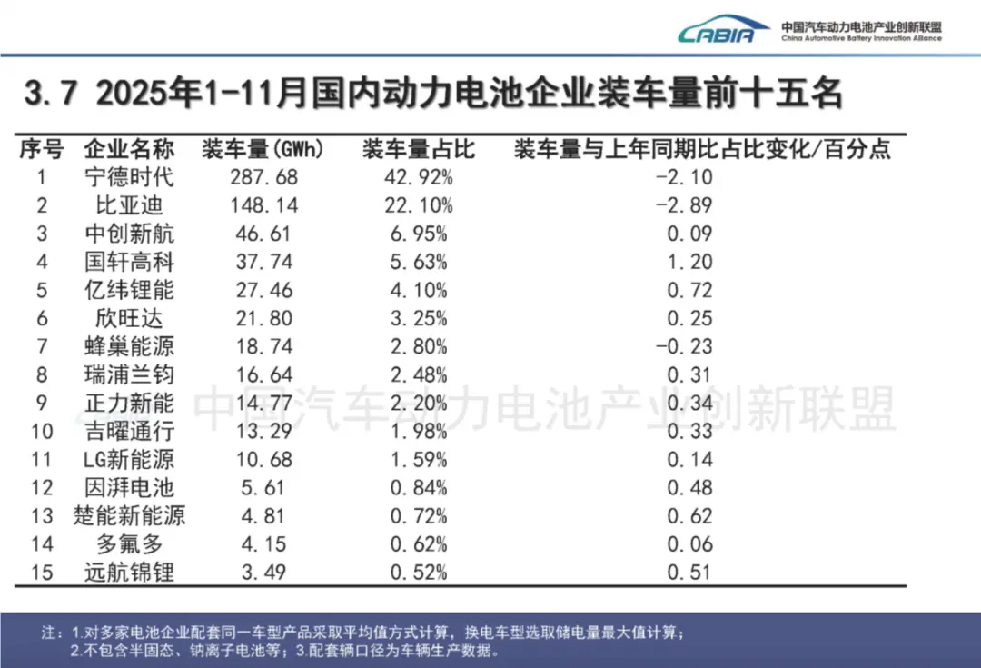 据中国汽车动力电池产业创新联盟数据,今年1-11月,宁德时代动力电池装车量达287.68GWh,装车量占比为42.92%。但与去年同期相比,这一占比下降了2.1个百分点。