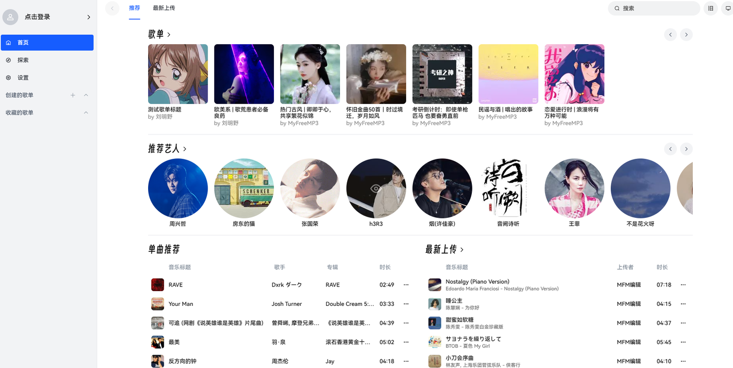 打开页面可以看到各种推荐的艺人、单曲推荐,新上传等分类,喜欢的音乐可以直接点击播放,也可以点击右侧的三个点就会出现免费下载按钮,还能单独下载封面一个歌词。