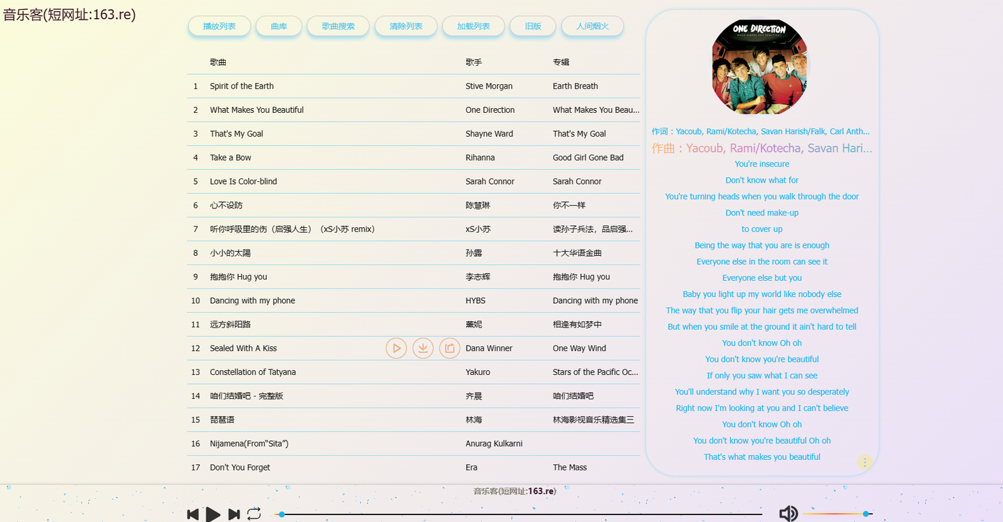 一个非常强大的音乐搜索网站,它支持输入歌名、歌手查找想听的音乐,比如搜索歌手名字,你可以找到所有演唱的歌曲,页面非常干净,打开就能看到很多歌曲以及搜索框。