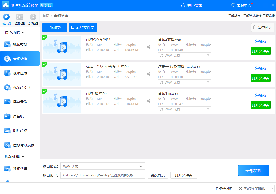 转换方法也简单,打开软件后直接点击音频转换,软件支持批量转换,然后点击左下角选择输出格式,选择完成后点击开始转换,最后点击开始转换就好了,简单两步就可以更改音频格式了,而且音频质量也不会有所改变。