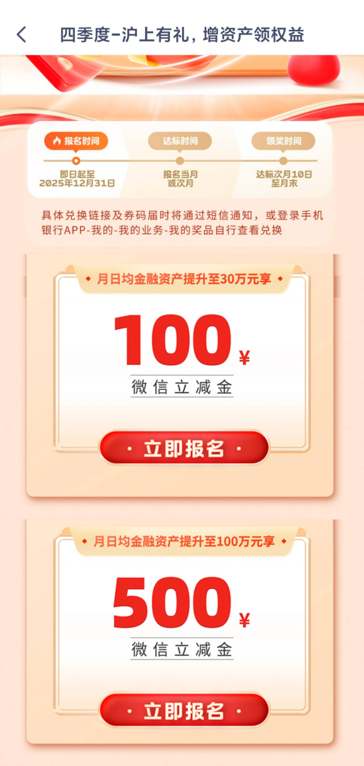 类似地,兴业银行App显示,即日起至12月31日,月日均金融资产提升至30万元可享100元微信立减金、提升至100万元可享500元微信立减金。