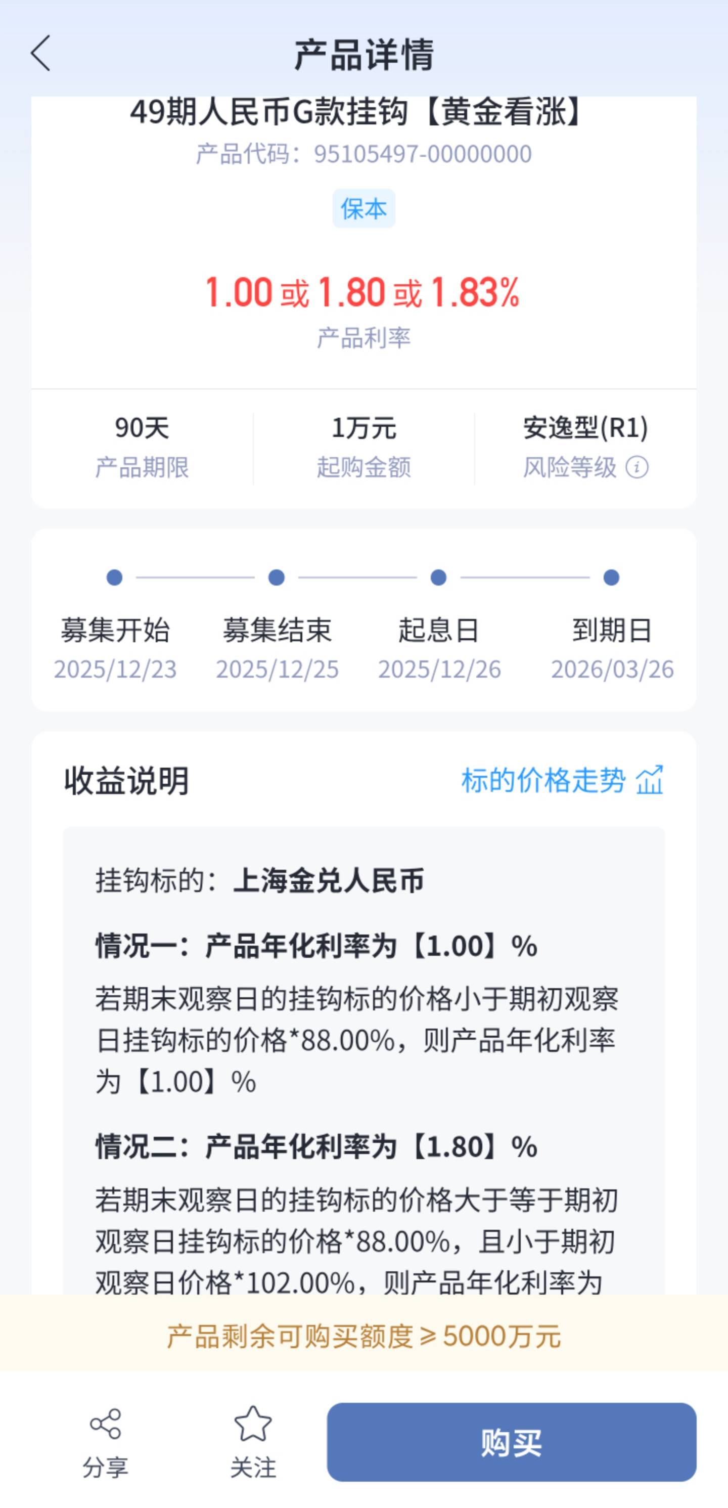 兴业银行、平安银行App显示,此类产品保本,且根据金价浮动会产生超额收益,产品的期限设置比较灵活,包括33天、61天、90天、98天、180天等,起购金额均为1万元。