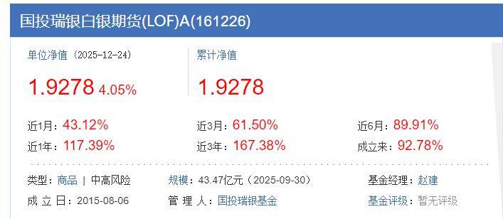 国投白银LOF成立于2015年8月,顺势成为此轮资金配置的核心标的。截至2025年三季度末,国投白银LOF基金A和C类份额合计规模达66.4亿元,较2024年末增加44.62亿元,增幅204.88%;其中可以场内交易的A类份额规模43.47亿元,较2024年末的8.27亿元增长425.63%。