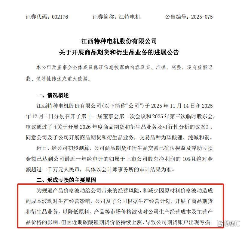 根据公告,江特电机于2025年11月14日、12月1日分别召开了董事会会议和临时股东会,审议通过了《关于开展2026年度商品期货和衍生品业务及可行性分析的议案》,同意公司及子公司开展商品期货和衍生品业务,交易品种为碳酸锂、纯碱和铜。